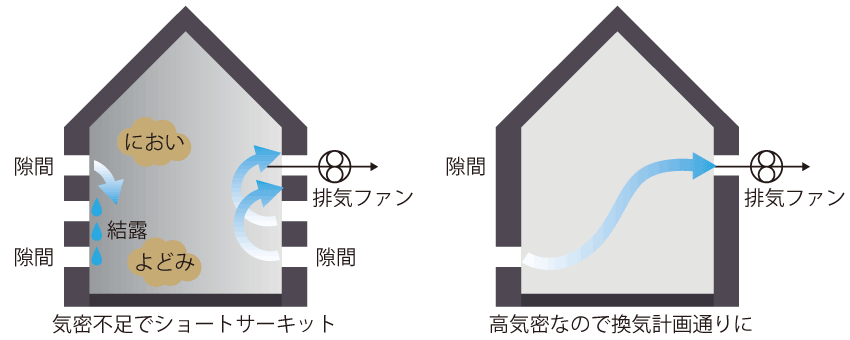 気密して換気扇を付けない場合は確かに息苦しくなります。ところが、現在の新築住宅では24時間換気の設置が義務付けられていますので、気密性の低い住宅の場合、排気用の換気扇が、近くのすき間からのみ空気を吸い出してしまい、換気されない空間が出来てしまう現象(ショートサーキット)が起こりやすくなります。つまり、気密不足の家の場合の方が息苦しい部屋が出来やすくなっています。このような換気が正しく機能しない状態を解消するためには、高い気密性能をもつことで、すき間からの空気の出入りもほとんどないため、気密は高い方が住まい全体の空気をよどみなく換気することが出来ます。